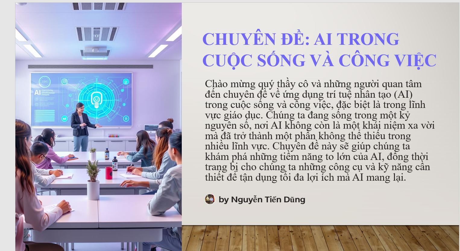 Sau phần khởi động, thầy Dũng dẫn dắt mọi người đi qua các giai đoạn phát triển của các cuộc cách mạng công nghiệp, từ cơ khí hóa, điện khí hóa, tự động hóa cho đến kỷ nguyên dữ liệu lớn. Đặc biệt, thầy nhấn mạnh rằng cuộc cách mạng công nghiệp lần thứ năm – kỷ nguyên của trí tuệ nhân tạo – đang dần thay đổi diện mạo của thế giới, và giáo dục cũng không nằm ngoài xu hướng này. Trí tuệ nhân tạo không còn là khái niệm xa lạ mà đã trở thành một phần không thể thiếu trong cuộc sống hàng ngày, nhất là trong công tác giảng dạy.