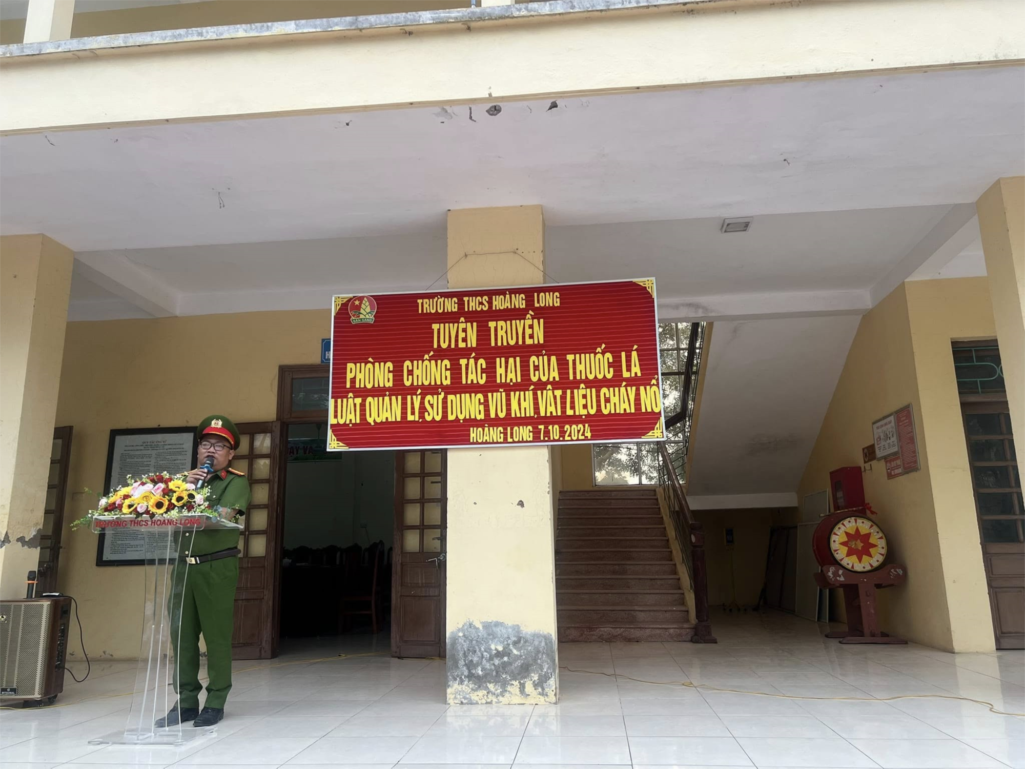 Vinh dự cho Nhà trường, trong buổi tuyên truyền được đón nhận sự phối hợp và chia sẻ của đồng chí Nguyễn Mạnh Hà - Trưởng công an xã Hoàng Long, đồng chí đã giới thiệu khái quát, những điều cơ bản trong Luật bảo quản và sử dụng vật liệu cháy nổ, những quy định của luật về việc các cá nhân, tổ chức được làm, không được làm đối với vật liệu cháy nổ, để đảm bảo an toàn cho cá nhân và cộng đồng.